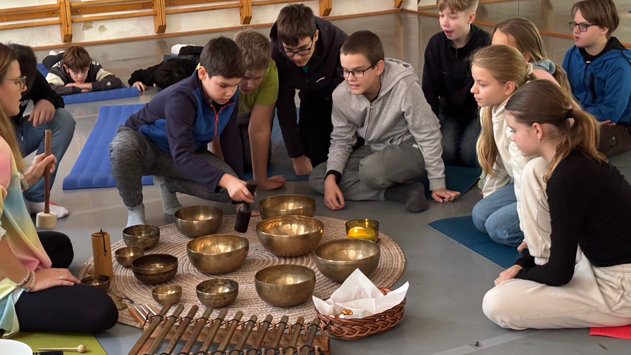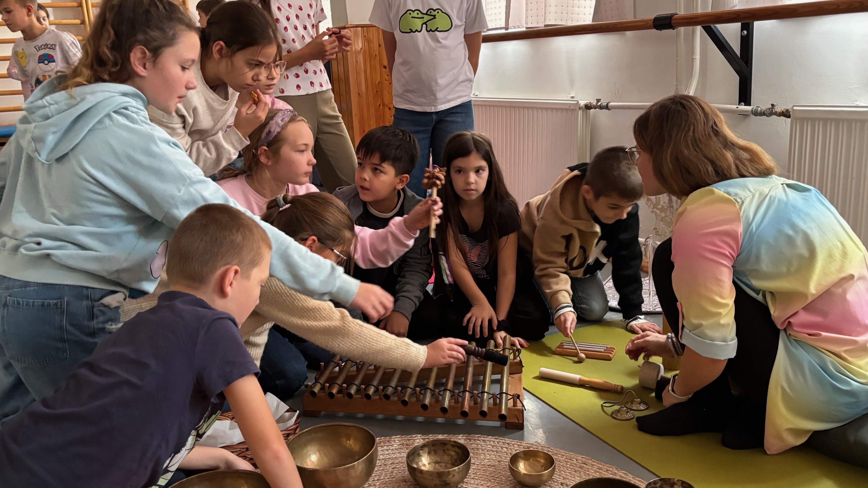 A negyedikesek lehetőséget kaptak a felsős programokba is bekapcsolódni. Egészen pontosan, részt vehettek egy „hangfürdőn", ahol tibeti hangtálakkal, kristálytállal, különleges rezgő hangszerekkel ismerkedhettek meg. Szabó-Somogyi Zsuzsanna egészen varázslatos hangokkal és illatokkal teremtett különleges atmoszférát, és vezetett relaxációval oldotta, majd töltötte fel a gyerekeket.
