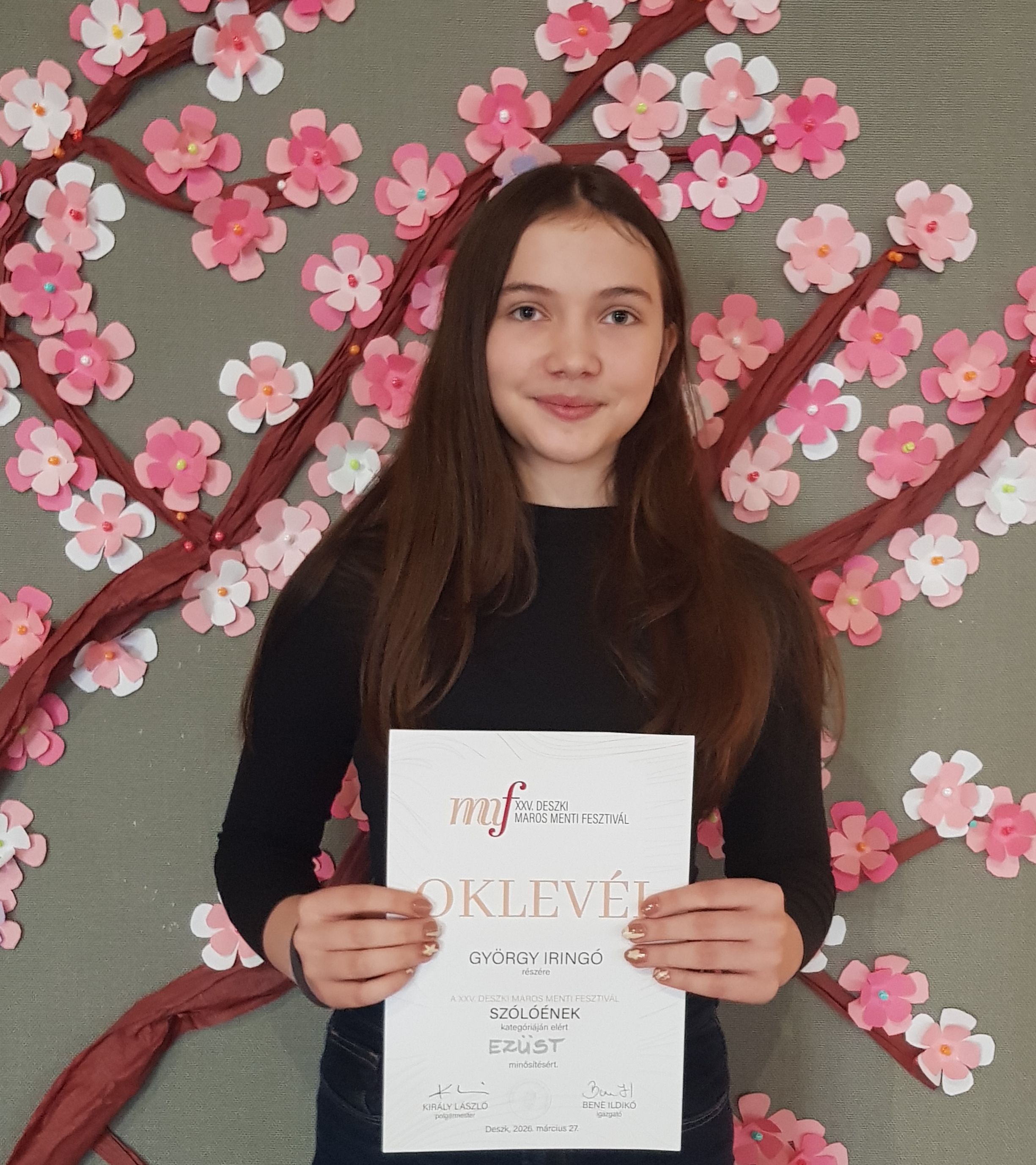 A eseményen iskolánk 7. m osztályos tanulója, György Iringó is képviseltette magát, aki tehetségével és magabiztos fellépésével a szakmai zsűrit is lenyűgözte. Iringó szóló ének kategóriában mérette meg magát, választása pedig Cserháti Zsuzsa egyik legnehezebb klasszikusára, a Boldogság, gyere haza című dalra esett. A zsűri tagjai nem fukarkodtak az elismerő szavakkal, és egyértelműen a zenei pálya folytatására biztatták őt.
